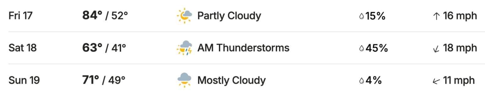 Saturday begins with a chance of morning thunderstorms before shifting cooler through the afternoon. Outdoor browsing remains workable, but it helps to keep at least one indoor stop in reserve while building the route.